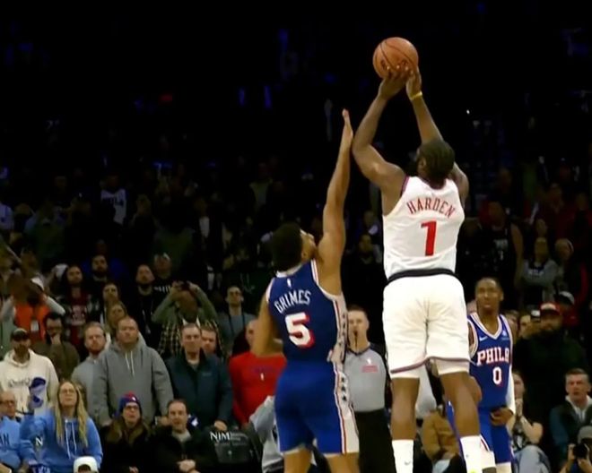 从慢镜头来看,我们可以清晰看到这一点。在哈登准备投出球之前, 格雷姆斯的手掌碰到了哈登的手臂。如果要吹的话,这肯定就是犯规了。别忘了,这个球还是三分球,如果到时给哈登三次罚球的话,他完全有机会通过罚球去绝杀比赛,奈何这一切都是让人唏嘘的。
